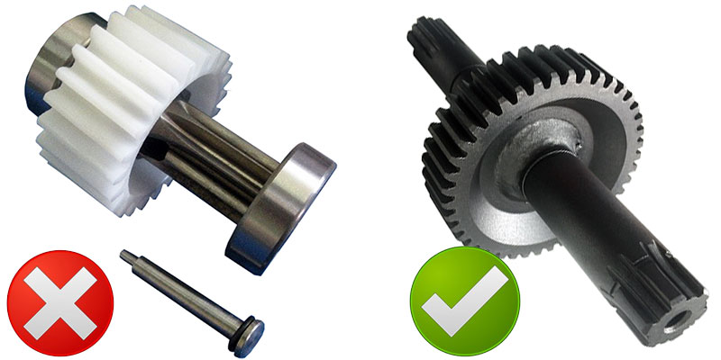 Перед тем, как купить шлагбаум, вы можете попросить продавца показать фотографии редуктора в разборе или запасные части, и, если вы имеете дело не с DEA, то, скорее всего, вам откажут, потому что устройство многих современных шлагбаумов больше напоминает детскую погремушку, чем серьёзный механизм. На фото выше, слева, шестерня шлагбаума не DЕА, справа – DEA.